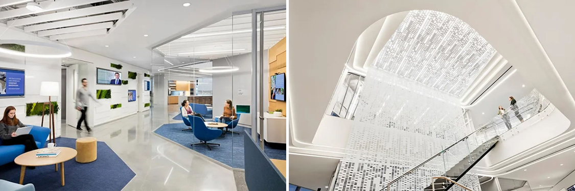 項目的設計遵循以一個大的設計原則,創建一個講科學、人和目的緊密連接的空間。這樣就能夠體現出水平和垂直連接的空間組織當中,以一個促進參與、分享和慶祝的社區中心。在活躍的社區中心設計有一道雕塑般的黑色鋼板樓梯,從14樓一直向下延伸到一個螺旋形的木質基座上。螺旋形基座,即是樓梯踏步、也是階梯座,為非正式聚會和全體人員大會提供了便利。