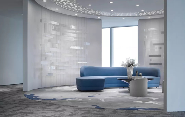 接著走進等候區,等候區的會以藍灰色調為主,懸浮在上空的智能飾品,顯示這是科技與未來相結合的空間。使用更具有空間與靈氣的流線飄逸的琉璃作為裝置藝術,貼合整個空間的立體、真實虛幻等科技的主題,配以冷色調的藍色予以神秘、深邃的感官。