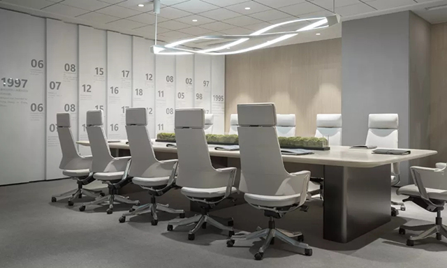 最后就是會議室,會議室繼續前面的簡潔的灰色調,墻面采用企業歷史的數字敘事化方式,既展示了企業的發展歷程,又創新了空間陳設方式,波浪形的定制燈飾散發著科技藝術的味道的同時,又呼應了整體設計理念。
